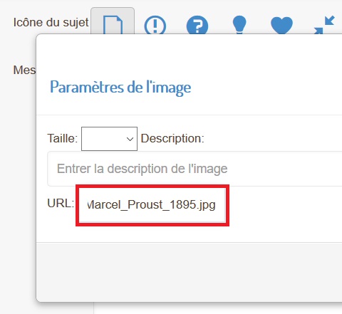 2) Positionner le curseur de votre souris à l'endroit de votre texte où vous souhaitez insérer l'image. Puis, dans la barre d'outils se trouvant juste au-dessus de la zone de texte, cliquer sur l'icône représentant une image :